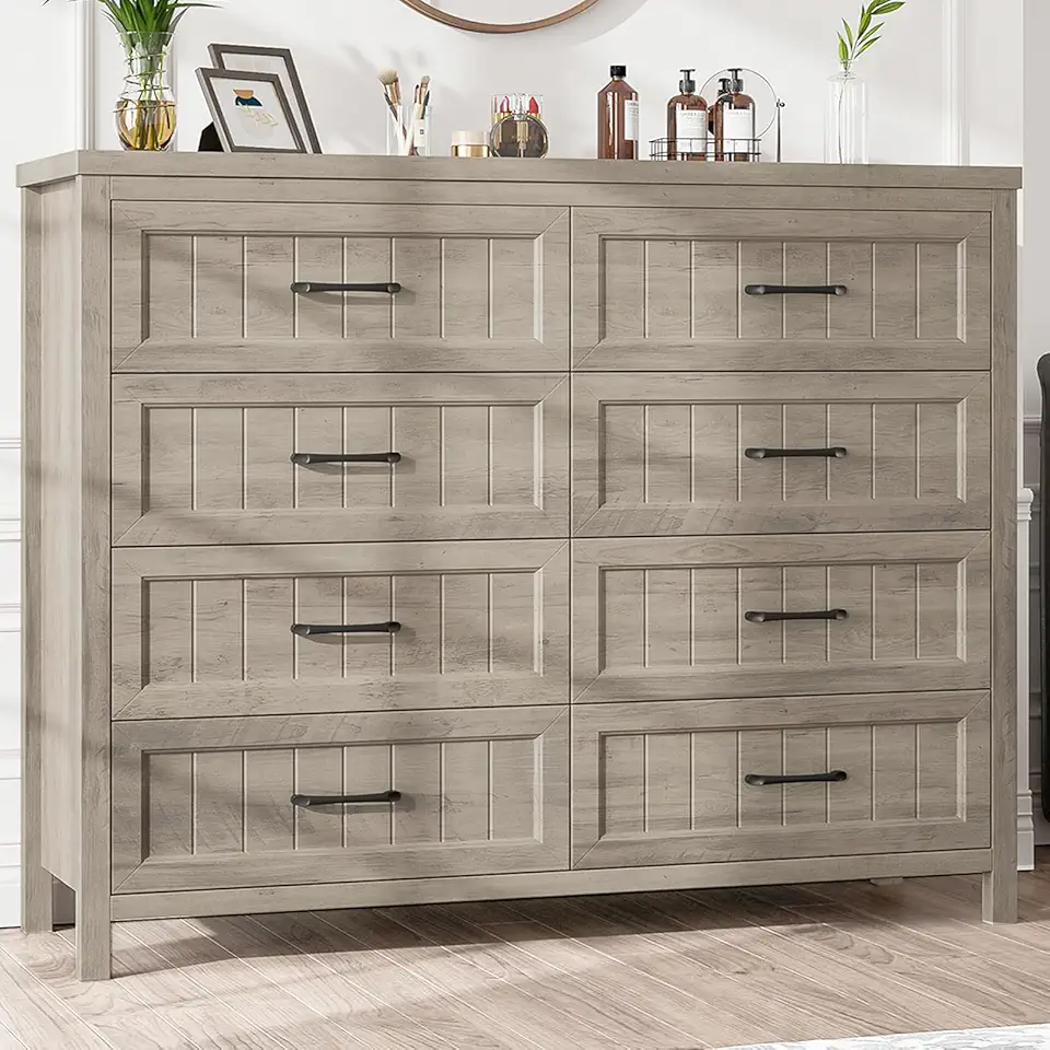 Jocoevol’s Farmhouse 8 Drawer Dresser in gray offers deep drawers for ample storage. This large wooden dresser is perfect for bedrooms, hallways, or entryways. Its durable construction and rustic style add timeless charm and organization to any home decor.
